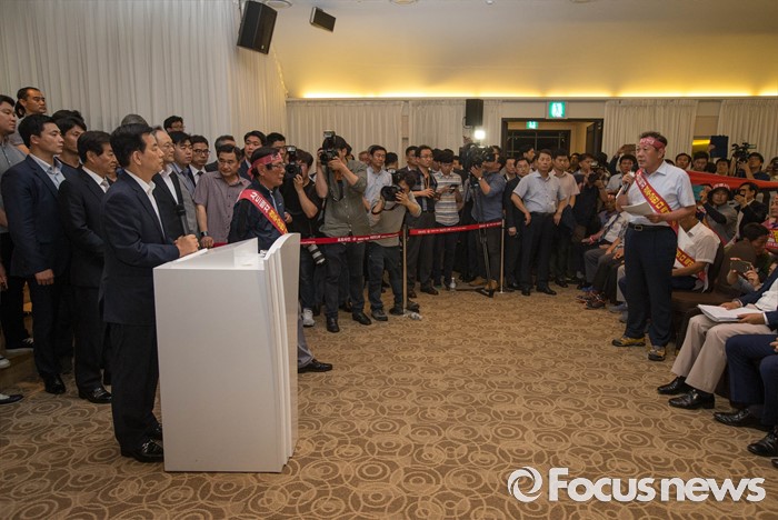 (서울=포커스뉴스) 13일 오후 한민구 국방부 장관이 경북 성주에 사드 배치를 확정한 국방부의 공식 발표 후 서울로 상경, 서울 용산 국방부 컨벤션센터를 항의 방문중인 김항곤 성주군 군수, 사회단체장 및 군민을 찾아 대화를 나누고 있다.