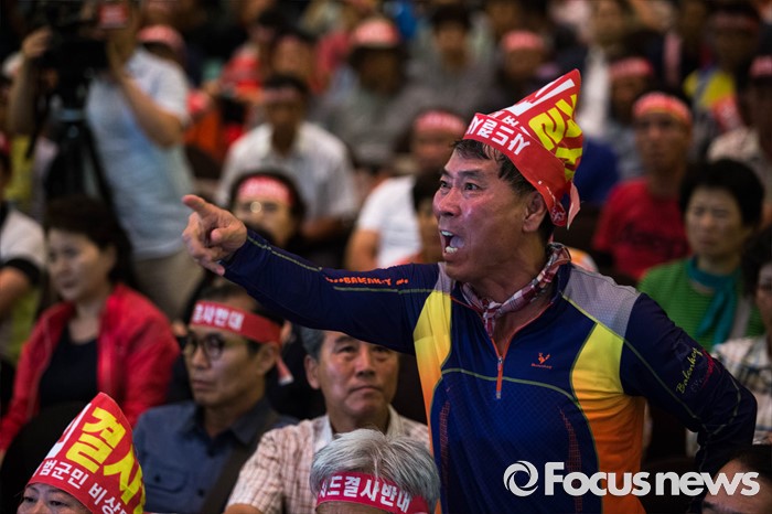 (서울=포커스뉴스) 한민구 국방부 장관이 13일 오후 서울 용산구 국방컨벤션센터에서 사드 배치에 항의 방문 중인 김항곤 성주군수 등 사회단체장 및 군민들에게 사과 발언을 하고 있다. 국방부는 이날 경북 성주군을 고고도 미사일 방어(사드·THAAD)체계 배치 지역이라고 공식 발표했다.
