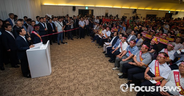 (서울=포커스뉴스) 한민구 국방부 장관이 13일 오후 서울 용산구 국방컨벤션센터에서 사드 배치에 항의 방문 중인 김항곤 성주군수 등 사회단체장 및 군민들에게 사과 발언을 하고 있다. 국방부는 이날 경북 성주군을 고고도 미사일 방어(사드·THAAD)체계 배치 지역이라고 공식 발표했다.