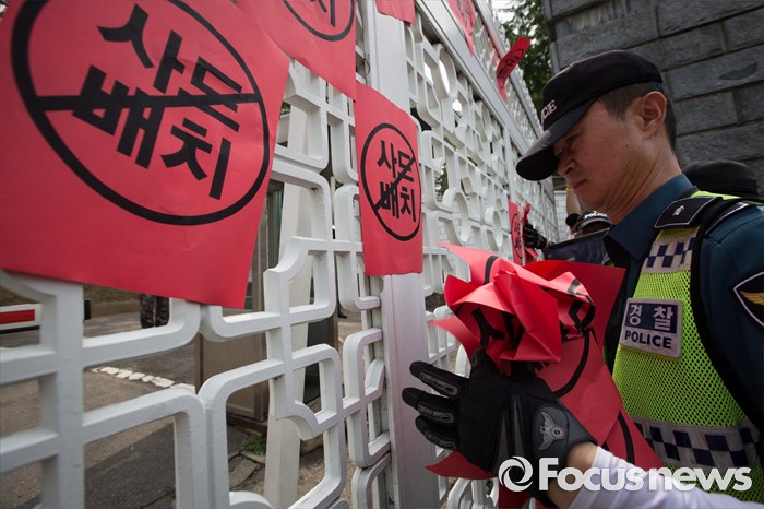 | △ 사드배치반대 스티커 떼어내는 경찰 |