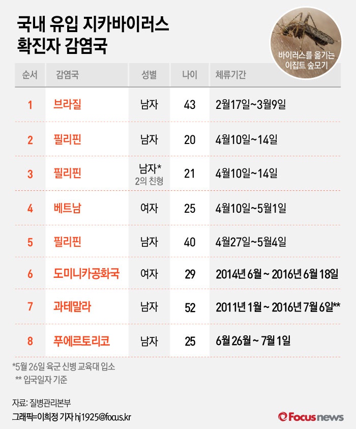 (서울=포커스뉴스) 국내 유입 지카바이러스 8번째 감염자가 발생했다. 질병관리본부에 따르면 국내 유입 지카바이러스 확진자 감염국은 필리핀, 베트남, 브라질, 도미니카공화국, 과테말라, 푸에르토리코 6개국이다.