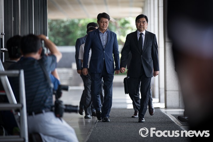 (서울=포커스뉴스) '주식 대박' 논란에 휩싸인 진경준(오른쪽) 검사장이 14일 오전 서울 서초구 서울중앙지방검찰청으로 출석하고 있다.