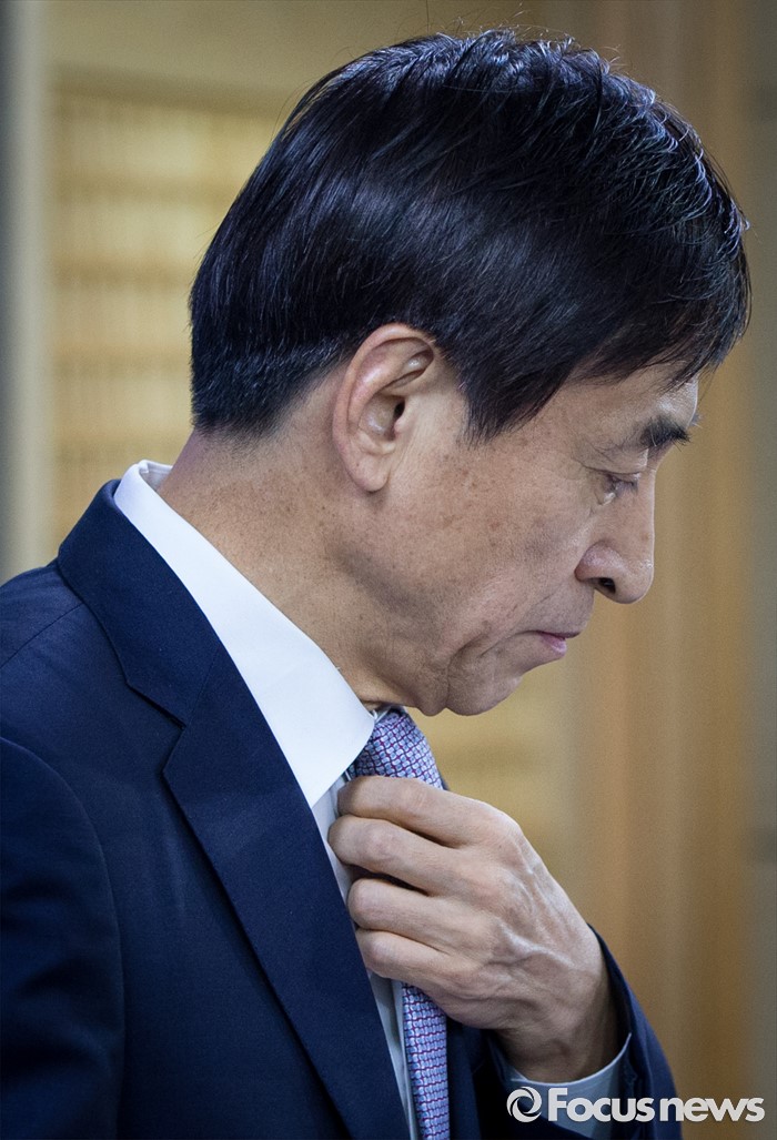 (서울=포커스뉴스) 이주열 한국은행 총재가 14일 오전 서울 중구 한국은행에서 통화정책방향에 대해 설명하기 전 넥타이를 고쳐 메고 있다. 한은은 이날 열린 제14차 금융통화위원회의를 통해 기준금리를 현 수준(1.25%)으로 동결했다.