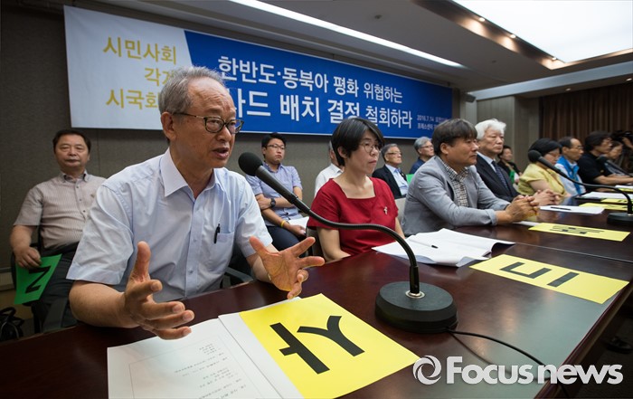 (서울=포커스뉴스) 14일 오전 서울 중구 한국프레스센터에서 시민 사회 각계 인사들이 모여 '한반도, 동북아 평화 위협하는 사드 배치 결정 철회 촉구' 시국회의를 하고 있다.