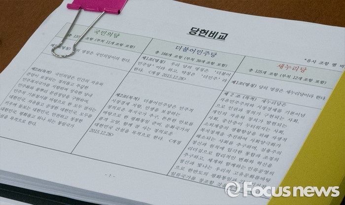 (서울=포커스뉴스) 14일 오전 서울 여의도 국회에서 열린 국민의당 당헌당규제개정위원회 1차 전체회의에 3당 당헌비교 자료가 보이고 있다.