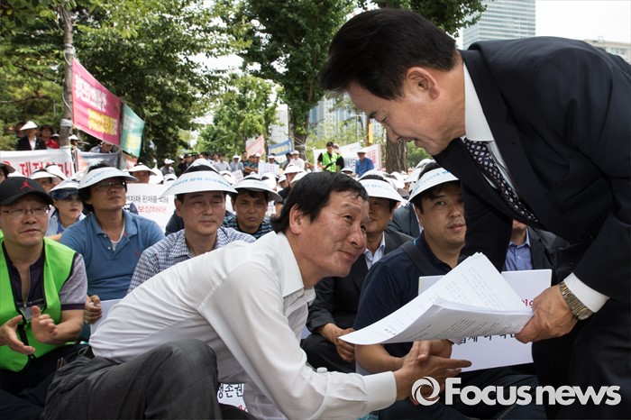 (서울=포커스뉴스) 14일 오후 서울 영등포구 국회의사당역 인근에서 정동영(오른쪽) 국민의당 의원이 개성공단 비상대책위원회원들의 실질보상 촉구 집회장을 찾아 정기섭 위원장과 악수를 나누고 있다.