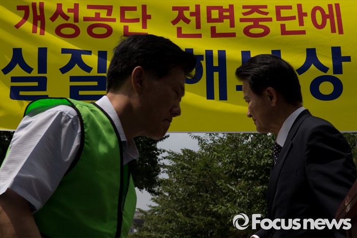 (서울=포커스뉴스) 14일 오후 서울 영등포구 국회의사당역 인근에서 정동영(오른쪽) 국민의당 의원이 개성공단 비상대책위원회원들의 실질보상 촉구 집회장을 찾아 격려하고 무대를 내려가고 있다.