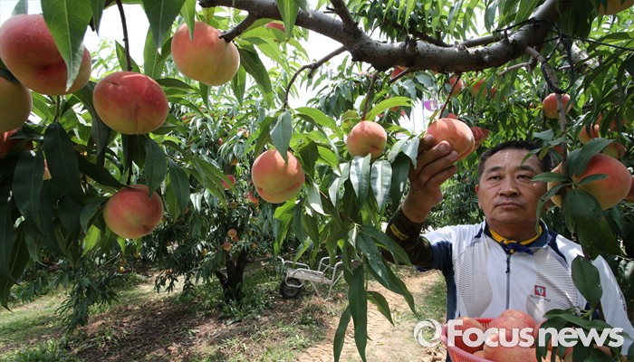 (세종=포커스뉴스) 초복을 사흘 앞둔 14일 세종시 조치원읍 복숭아농장에서 농민이 복숭아를 따고 있다.
