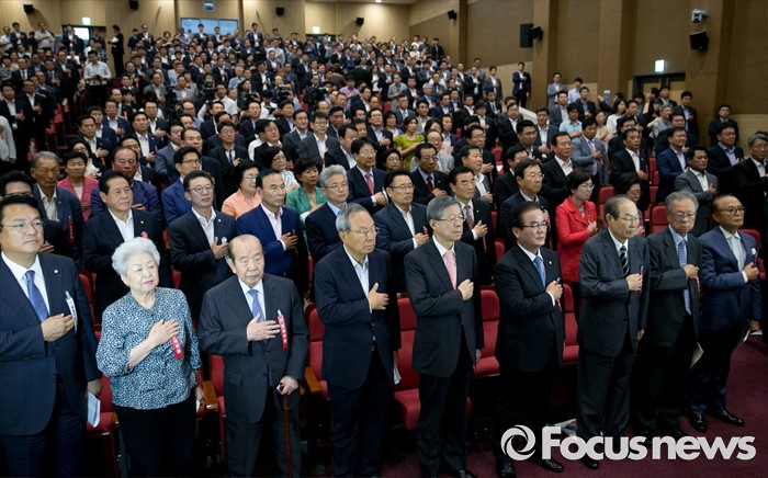 (서울=포커스뉴스) 14일 오후 서울 여의도 국회 의원회관에서 열린 새누리당 전국위원회에 참석한 정진석(앞줄 왼쪽부터) 원내대표, 이연숙, 김수한 상임고문, 박관용 전 국회의장, 김희옥 혁신비대위원장, 정갑윤 전국위의장, 정재철, 박희태 상임고문 등이 국기에 대한 경례를 하고 있다.