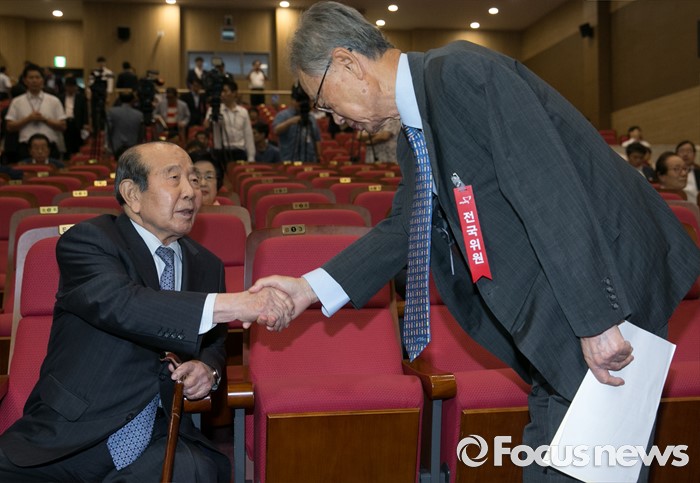 (서울=포커스뉴스) 14일 오후 서울 여의도 국회 의원회관에서 열린 새누리당 전국위원회에 참석한 김수한(왼쪽), 박희태 상임고문이 인사하고 있다.