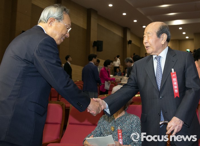 (서울=포커스뉴스) 14일 오후 서울 여의도 국회 의원회관에서 열린 새누리당 전국위원회에 참석한 김수한(오른쪽) 상임고문과 박관용 전 국회의장이 인사하고 있다.