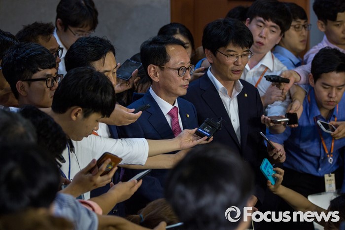 (서울=포커스뉴스) 박완주(오른쪽) 더불어민주당 원내수석부대표가 14일 오후 서울 여의도 국회에서 여야3당 원내수석부대표 합의사항을 발표한 뒤 취재진 질문에 답하고 있다. 이날 여야3당은 사드(고고도미사일방어체계) 국내 배치 결정에 따른 논한과 관련해 다음주 긴급 현안 질의를 위한 국회 본회의를 개최하는데 합의 했다고 밝혔다.