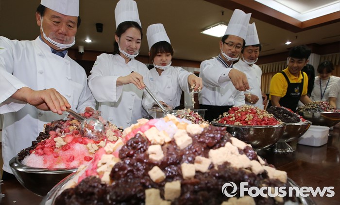 (대전=포커스뉴스) 초복을 사흘 앞둔 14일 오후 대전 유성구청에서 열린 팥빙수데이 행사에서 허태정 구청장과 직원들이 함께 팥빙수를 만들고 있다. 이번 팥빙수데이 행사에는 팥빙수 900인분을 만들어 구 산하 직원들에게 전달했다.