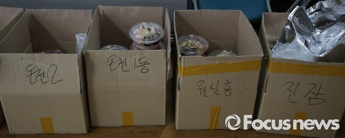 (대전=포커스뉴스) 초복을 사흘 앞둔 14일 오후 대전 유성구청에서 열린 팥빙수데이 행사에서 허태정 구청장과 직원들이 함께 만든 팥빙수가 각 동별로 구분되어 있다. 이번 팥빙수데이 행사에는 팥빙수 900인분을 만들어 구 산하 직원들에게 전달했다.