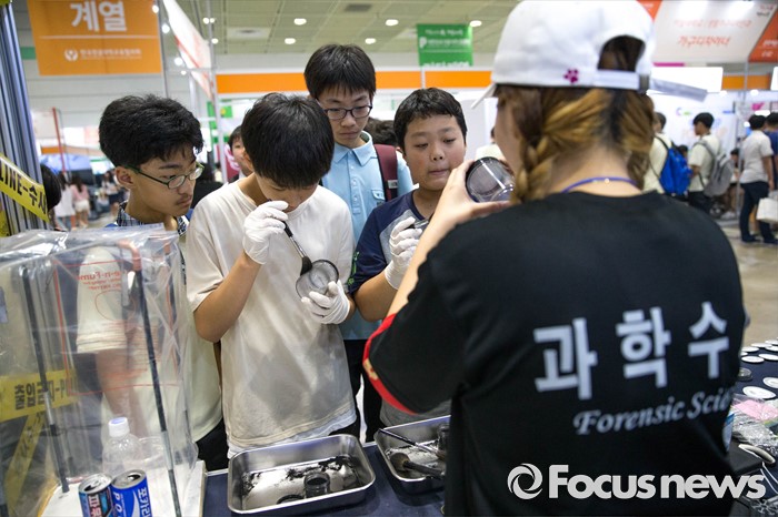 (서울=포커스뉴스) 14일 오후 서울 강남구 코엑스에서 열린 전문대학 엑스포에 참가한 학생들이 과학수사 기법을 체험하고 있다.