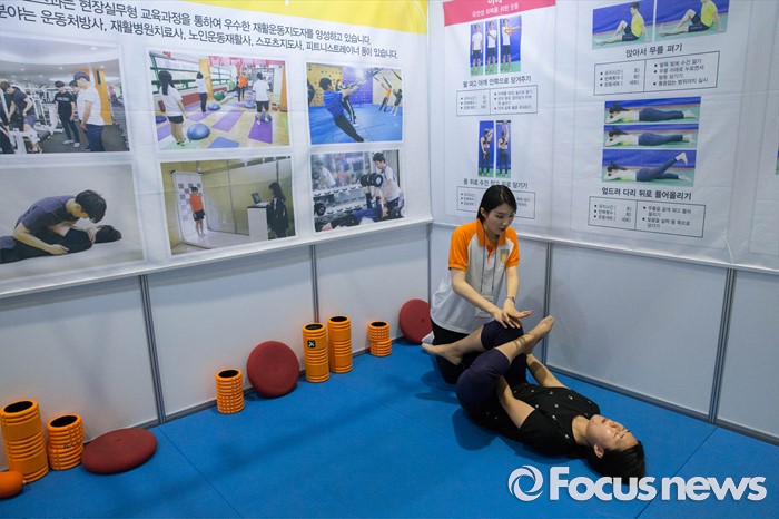 (서울=포커스뉴스) 14일 오후 서울 강남구 코엑스에서 열린 전문대학 엑스포에 참가한 한 시민이 물리치료를 체험하고 있다.