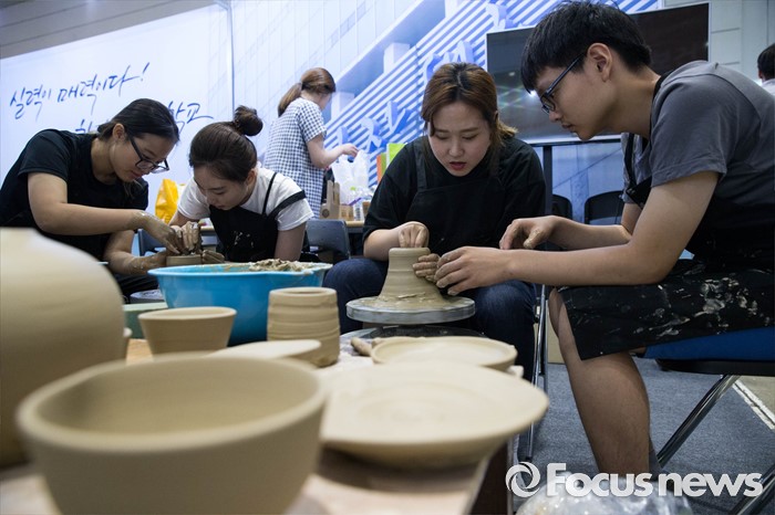 (서울=포커스뉴스) 14일 오후 서울 강남구 코엑스에서 열린 전문대학 엑스포에 참가한 시민들이 도예수업을 듣고 있다.