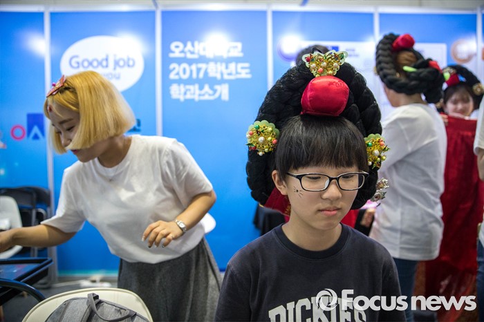 (서울=포커스뉴스) 14일 오후 서울 강남구 코엑스에서 열린 전문대학 엑스포에 참가한 한 학생이 조선시대 가체머리를 체험하고 있다.