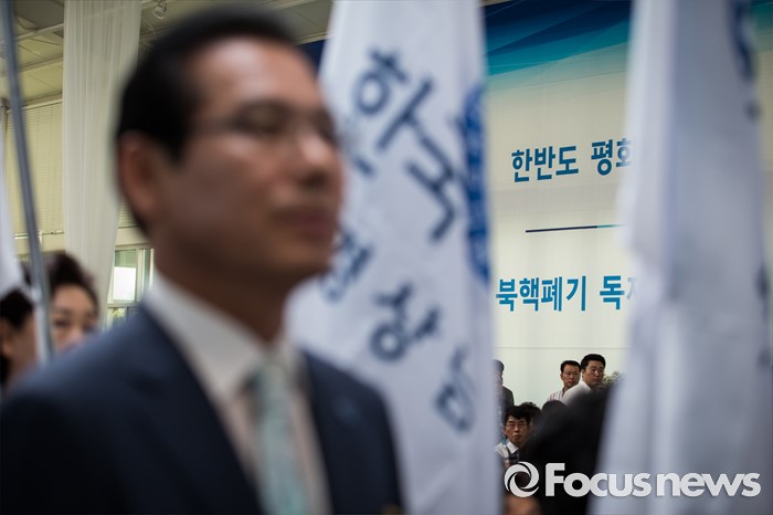 (서울=포커스뉴스) 14일 오후 서울 중구 한국자유총연맹 본부에서 '한국자유총연맹 창립 62주년 기념 통일 선봉대 출범식' 이 열리고 있다. 이날 출범식을 마친 김경재 한국자유총연맹 회장(전 박근혜 대통령 홍보특별보좌관)과 연맹 회원들은 사드 배치를 지지하는 결의 행동을 했다.