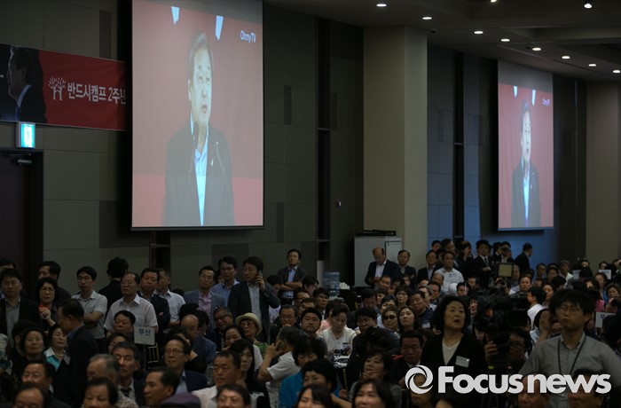 (서울=포커스뉴스) 14일 오후 서울 영등포구 그랜드컨벤션센터에서 열린 김무성 새누리당 전 대표 취임 2주년 행사에 참석한 지지자들이 김 전 대표의 영상을 시청하고 있다.