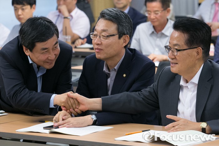 (서울=포커스뉴스) 14일 오후 서울 여의도 국회 의원회관에서 국민의당 주최로 열린 '국민의 동의없는 사드 배치 올바른 결정인가' 토론회에 참석한 이종걸(왼쪽부터) 더불어민주당 비대위원과 김성식 국민의당 정책위의장, 박지원 비대위원장이 인사하고 있다.
