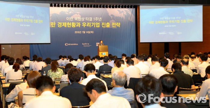 (서울=포커스뉴스) 대한상공회의소는 14일 세종대로 상의회관에서 대한무역투자진흥공사(KOTRA), 법무법인 율촌과 공동으로 '이란 협상 타결 1주년' 세미나를 열었다.