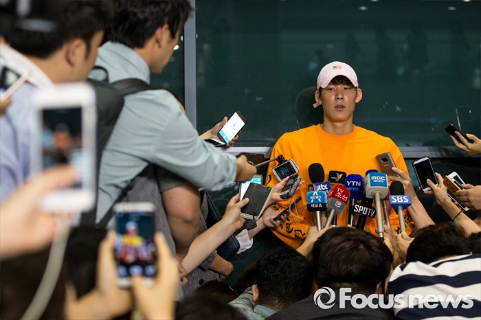 (인천공항=포커스뉴스) 리우 올림픽 출전이 확정된 '마린보이' 박태환이 호주 전지훈련을 마치고 14일 오후 인천국제공항을 통해 입국해 기자회견을 하고 있다.