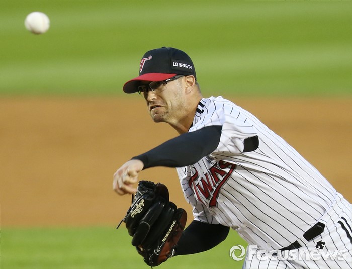 (서울=포커스뉴스) 14일 서울 잠실구장에서 열린 2016 프로야구 한화-LG 경기에서 LG의 새 외국인 투수 허프가 3회에 등판해 위력적인 투구를 하고 있다.