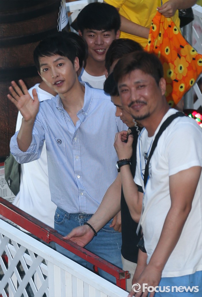 (서울=포커스뉴스) 14일 오후 서울 서대문구 신촌 일대에서 열린 '제2회 신촌맥주축제'에 참석한 배우 송중기가 인사하고 있다.
