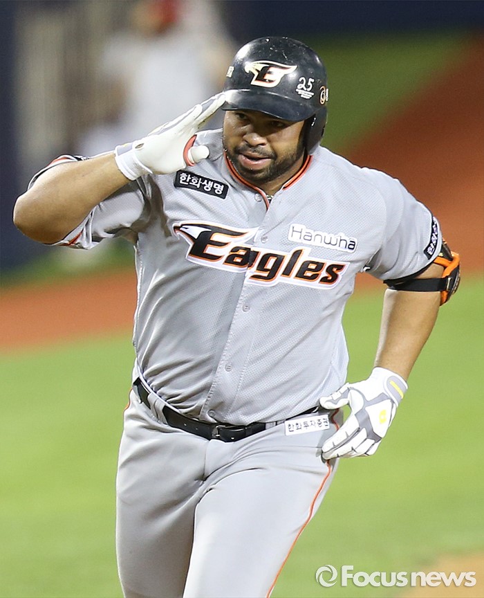 (서울=포커스뉴스) 14일 서울 잠실구장에서 열린 2016 프로야구 한화-LG 경기 7회초 2사후 한화 로사리오가 우중월 솔로 홈런을 치고 3루를 돌며 경례를 하고 있다.