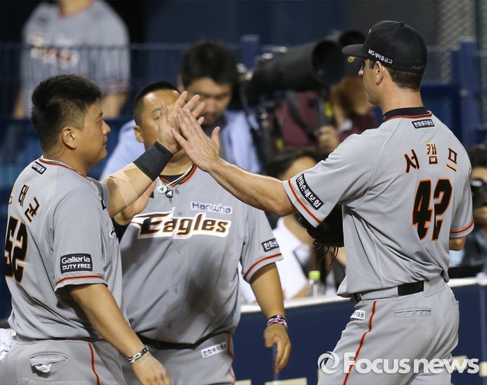 (서울=포커스뉴스) 14일 서울 잠실구장에서 열린 2016 프로야구 한화-LG 경기 5회말 한화 김태균이 교체돼 덕아웃으로 들어오는 투수 서캠프를 맞이하고 있다.