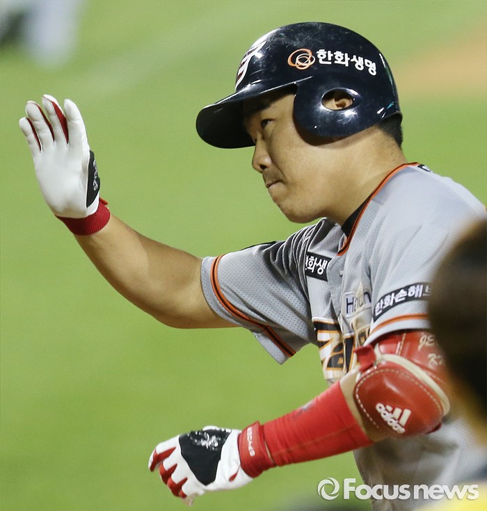(서울=포커스뉴스) 14일 서울 잠실구장에서 열린 2016 프로야구 한화-LG 경기 6회말 2사후 한화 정근우가 좌월 솔로 홈런을 치고 홈인하고 있다.
