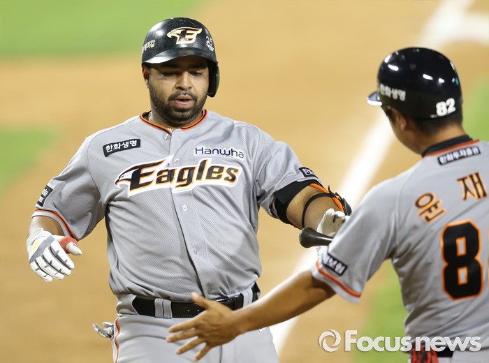(서울=포커스뉴스) 14일 서울 잠실구장에서 열린 2016 프로야구 한화-LG 경기 7회초 2사후 한화 로사리오가 우중월 솔로 홈런을 치고 윤재국 코치의 환영을 받으며 홈인하고 있다.