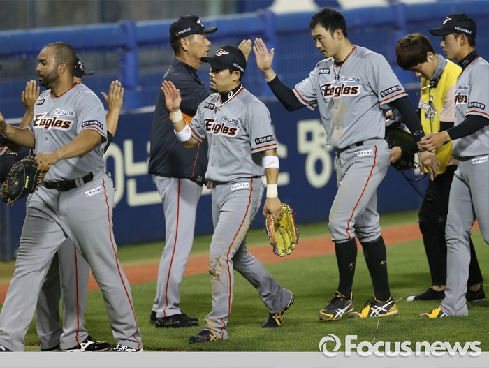 (서울=포커스뉴스) 14일 서울 잠실구장에서 열린 2016 프로야구 한화-LG 경기에서 LG에 승리하며 순위 바꿈을 해 7위로 올라선 한화 김성근 감독과 선수들이 하이파이브하고 있다.