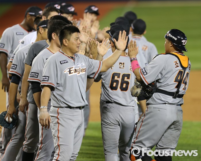 (서울=포커스뉴스) 14일 서울 잠실구장에서 열린 2016 프로야구 한화-LG 경기에서 LG에 승리하며 순위 바꿈을 해 7위로 올라선 한화 선수들이 하이파이브하고 있다.