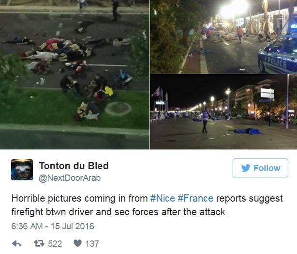 한편 이날은 프랑스 국경일로 1789년 프랑스 혁명의 발단이 된 바스티유 감옥 습격을 기념하는 날이다. 사고가 발생한 지점에서는 기념일 축제가 열려 수많은 군중이 몰렸다.14일(현지시간) 프랑스 남부 해안도시 니스에서 트럭 돌진으로 수백명의 사상자가 발생했다. <사진출처=트위터>