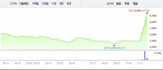 이는 일주일 전 주가인 8일(4900원)과 비교했을 때 88.5% 상승한 수치다.