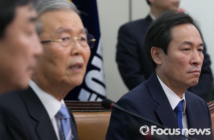 (서울=포커스뉴스) 15일 오전 서울 여의도 국회에서 열린 더불어민주당 비상대책위원회의에 참석한 우상호(오른쪽) 원내대표가 김종인(가운데) 비대위 대표의 모두발언을 듣고 있다.