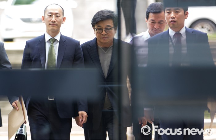 (서울=포커스뉴스) 대우조선해양 경영 비리에 연루된 이창하(왼쪽 두번째) 디에스온 대표가 영장실질심사를 받기 위해 15일 오전 서울중앙지법으로 들어서고 있다.