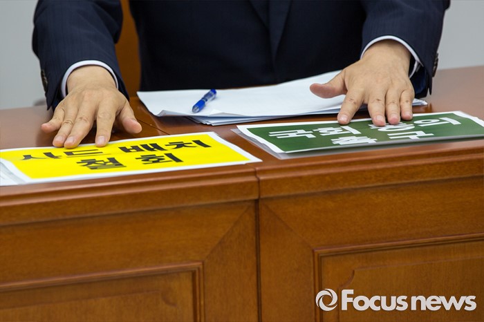(서울=포커스뉴스) 김성식 국민의당 정책위의장이 15일 오전 서울 여의도 국회에서 열린 '비대위원-중진의원 연석회의'에 참석해 '사드배치 철회, 국회동의 촉구'란 문구가 담긴 피켓을 만지고 있다.