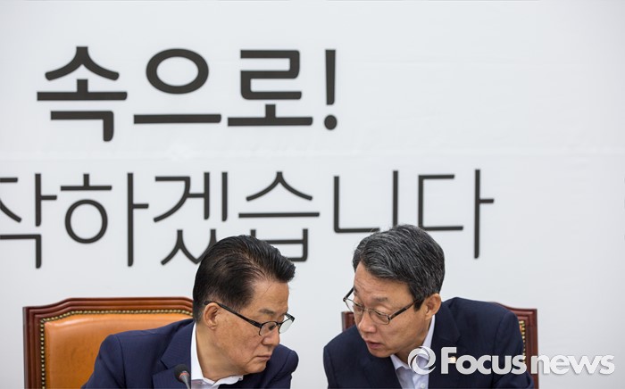(서울=포커스뉴스) 박지원(왼쪽) 국민의당 비상대책위원장과 김성식 정책위의장이 15일 오전 서울 여의도 국회에서 열린 '비대위원-중진의원 연석회의'에 참석해 대화 하고 있다.