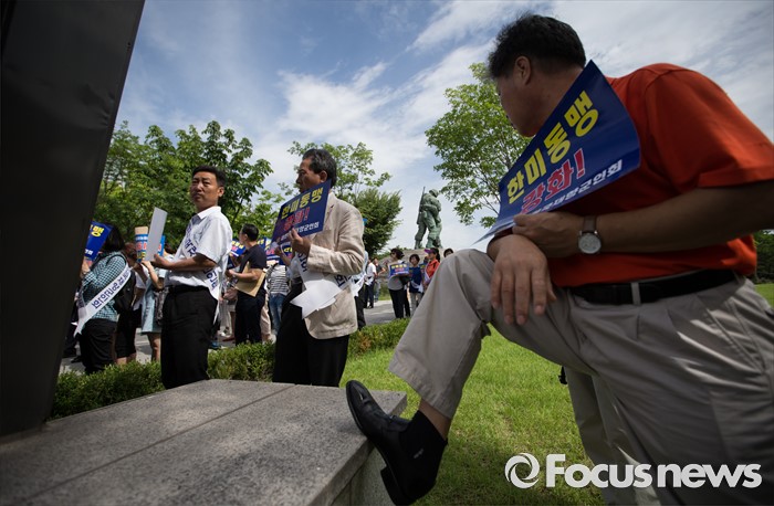 (서울=포커스뉴스) 15일 오전 서울 용산 국방부 앞에서 재향군인회 회원들 및 관계자들이 사드 배치 환영 기자회견을 하고 있다.