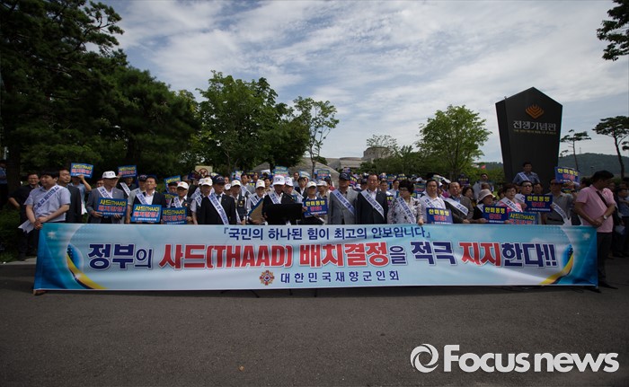 (서울=포커스뉴스) 15일 오전 서울 용산 국방부 앞에서 재향군인회 회원들 및 관계자들이 사드 배치 환영 기자회견을 하고 있다.
