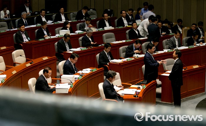 (서울=포커스뉴스) 15일 오전 서울 여의도 국회에서 예정된 예산결산특별위원회 전체회의에 참석한 국무위원들이 회의 시작을 기다리며 대화하고 있다. 이날 새누리당은 더불어민주당 소속 홍영표 국회 환경노동위원장이 야당 단독으로 예비비 지출안 등을 처리한 것과 관련해 홍 위원장의 사퇴를 요구하며 모든 상임위 보이콧을 선언했다.