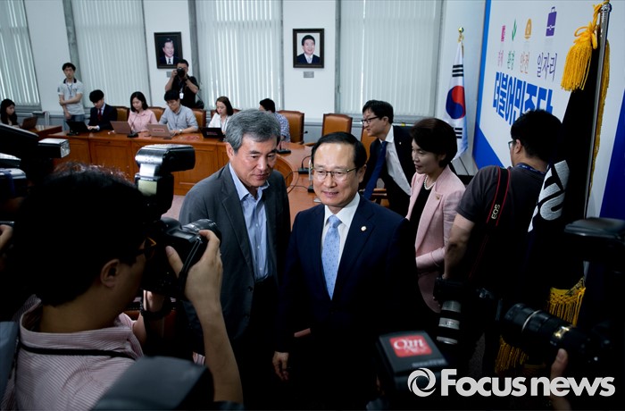 (서울=포커스뉴스) 15일 오전 서울 여의도 국회에서 홍영표 국회 환경노동위원장과 야당 환노위원들이 결산 표결 관련 입장을 전하는 기자간담회를 마친 뒤 퇴장하고 있다. 이날 새누리당은 더불어민주당 소속 홍 위원장이 야당 단독으로 예비비 지출안 등을 처리한 것과 관련해 위원장 사퇴를 요구하며 모든 상임위 보이콧을 선언했다.