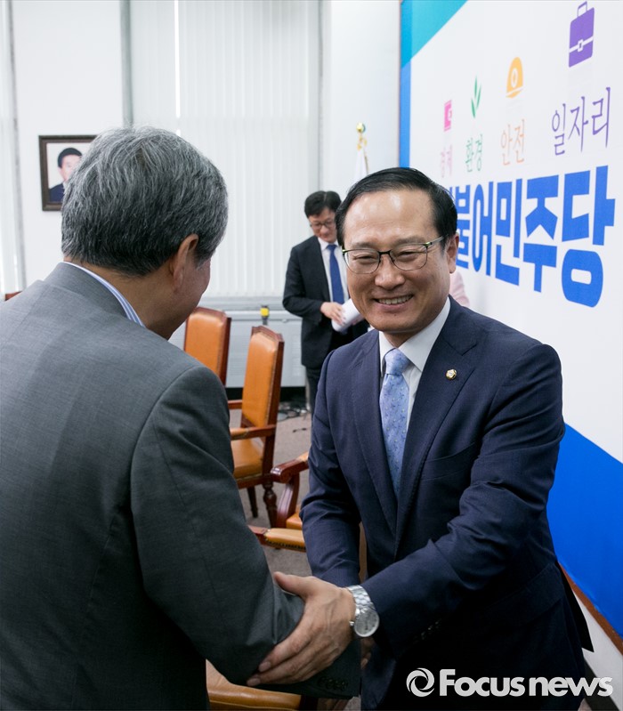 | △ 환노위원들과 악수하는 홍영표 위원장 |
