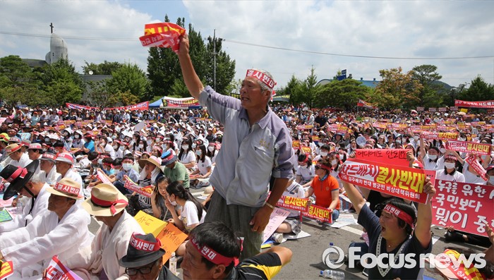(성주=포커스뉴스) 황교안 국무총리와 한민구 국방부장관이 15일 오전 경북 성주군청광장에서 사드(THAAD, 고고도미사일방어체계) 배치에 대한 주민설명회를 가진 가운데 주민이 사드배치 반대 항의를 하고 있다.