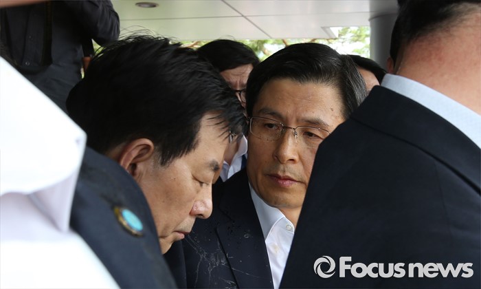 (성주=포커스뉴스) 황교안 국무총리와 한민구 국방부장관이 15일 오전 경북 성주군청광장에서 사드(THAAD, 고고도미사일방어체계) 배치에 대한 주민설명회에서 대화를 하고 있다.