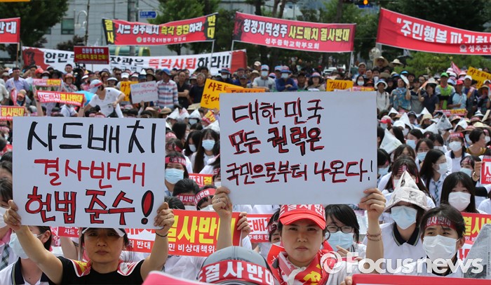 (성주=포커스뉴스) 황교안 국무총리와 한민구 국방부장관이 15일 오전 경북 성주군청광장에서 사드(THAAD, 고고도미사일방어체계) 배치에 대한 주민설명회를 가진 가운데 성주 주민들이 사드배치 반드를 주장하고 있다.