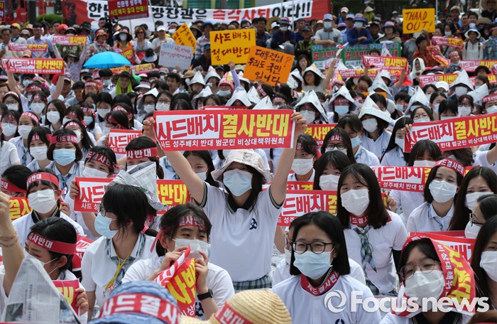 (성주=포커스뉴스) 황교안 국무총리와 한민구 국방부장관이 15일 오전 경북 성주군청광장에서 사드(THAAD, 고고도미사일방어체계) 배치에 대한 주민설명회를 가진 가운데 성주 주민들이 사드배치 반드를 주장하고 있다.